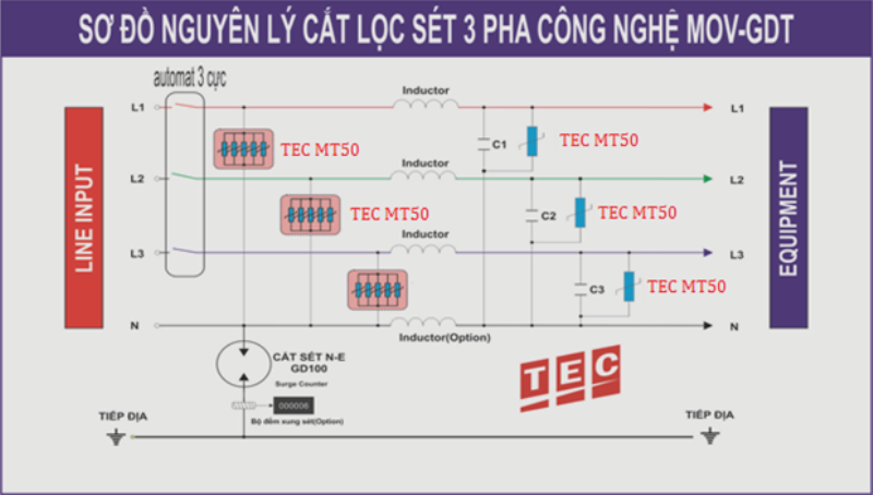 - Cắt lọc sét TEC SRF-MOV được lắp đặt treo trên tường và nối tiếp với tải cần bảo vệ.
