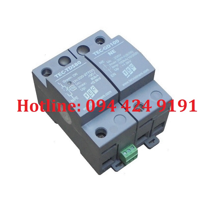 - Thiết bị cắt sét gắn trên DIN TEC TDS80bao gồm module bảo vệ L-N với mã hàng TDS80 & module bảo vệ N-E với mã GD100.