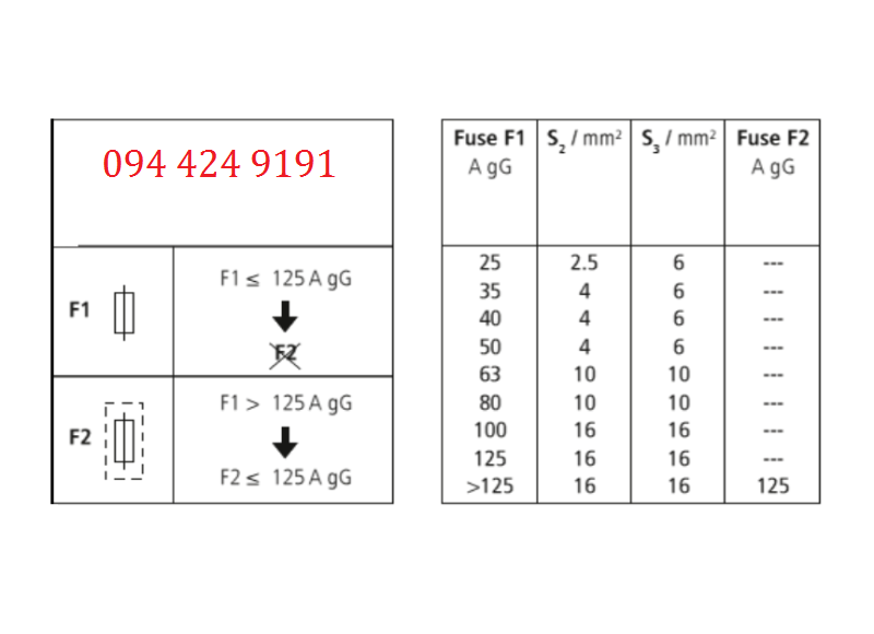 + Cáp đấu nối | Tiết diện 4÷14mm2. | Tiết diện 4÷14mm2. |