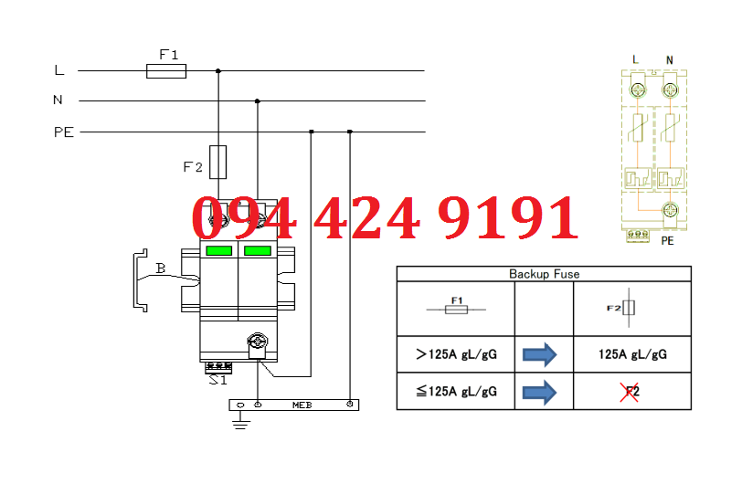 - Dòng tải phù hợp đấu nối chống sét | : ≤ 125A |