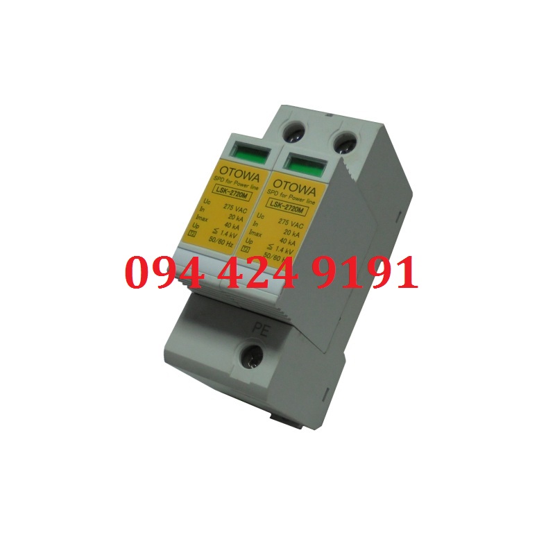 - Thiết bị cắt sét 1 pha 1P+N, bảo vệ Type 2, dòng cắt sét bình thường In: 20kA, Imax: 40kA xung 8/20µs. Un: 230V, Uc: 275V, Up: ≤ 1.4kV, tần số làm việc 50/60Hz, có màn hình hiển thị trạng thái làm việc Modul cắt sét. Mã hàng: LSK-N2720S. Xuất xứ: Otowa-Trung Quốc. Đơn giá: 1.450.000 vnđ/cái