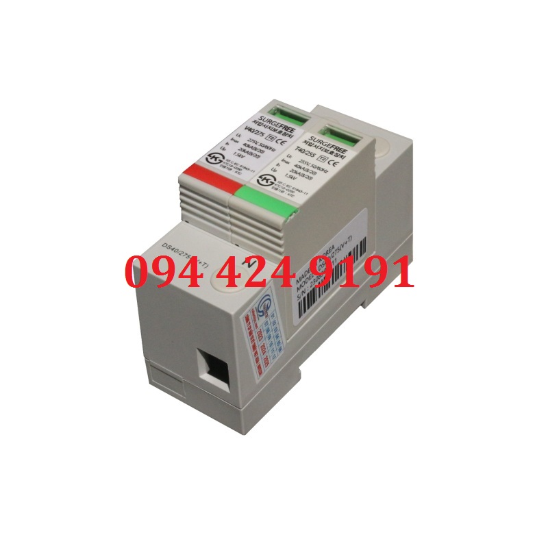- Chống sét lan truyền đường EVN DS40-275, dòng cắt sét In 20kA, Imax 40kA. Bảo vệ Class II+Class III theo tiêu chuẩn IEC, Type 2+Type 3 theo tiêu chuẩn EN. Sản phẩm được sản xuất bởi hãng Surge Free-Korea.