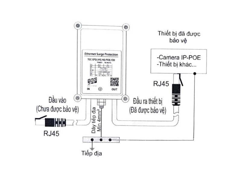 - Thiết bị chống sét cho đường tín hiệu Camera IP, Wifi, Ethernet ngoài trời SPD/J45/48/POE/OD được lắp đặt nối tiếp có ghi sẵn đầu In, Out, Tiếp địa.