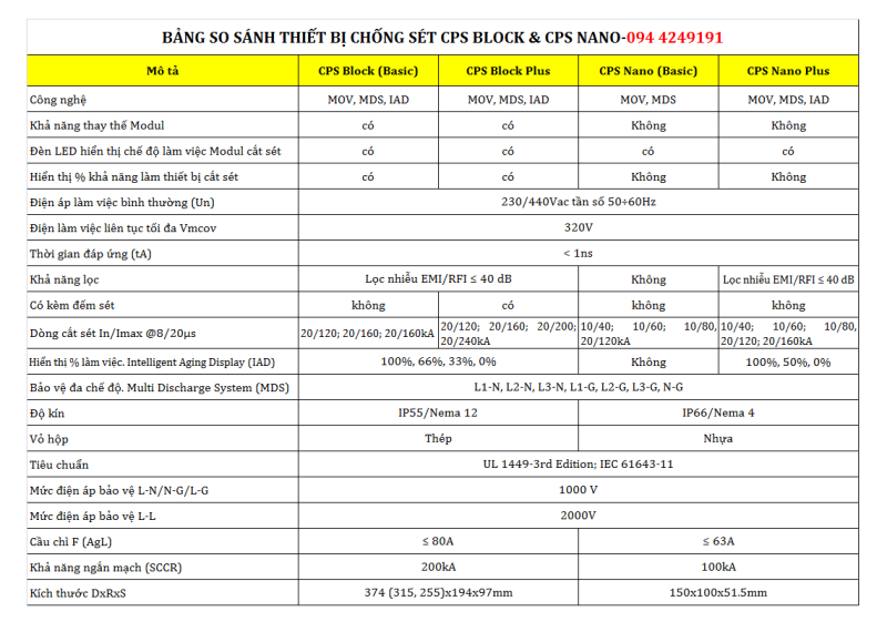 - Khả năng cắt sét Imax CPS Block Plus lên tới 240kA, trong khi các dòng CPS Nano Plus chỉ lên tới 160kA.