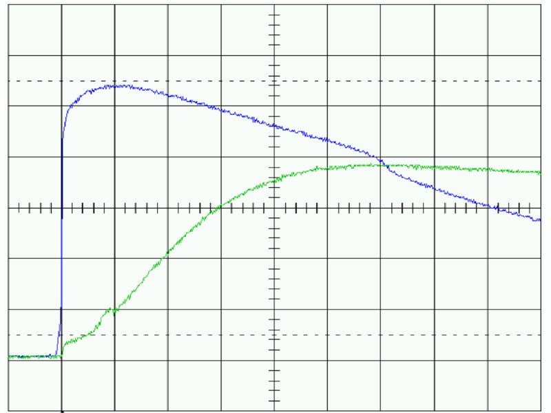 - Hình dưới đây thể hiện sự khác biệt về hiệu suất giữa bộ bảo vệ cắt sét song song và bộ bảo vệ cắt lọc sét mắc nối tiếp TEC. Đường màu xanh lam là điện áp trên bộ bảo vệ mắc song song khi chịu tác động của xung dòng điện điển hình, trong khi đường màu xanh lục là điện áp trên bộ lọc mắc nối tiếp.