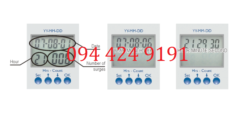 + Để tiết kiệm năng lượng nên màn hình LCD của bộ đếm sét Erico sẽ được tắt để bật lại chúng ta bấm vào bất kỳ phím nào trên thiết bị. Khi bật màn hình LCD sẽ có những thông số sau: năm/ngày/tháng ở trên cùng, giờ ở phía dưới bên trái, số lần thiết bị đếm sét ghi nhận ở góc dưới bên phải.
