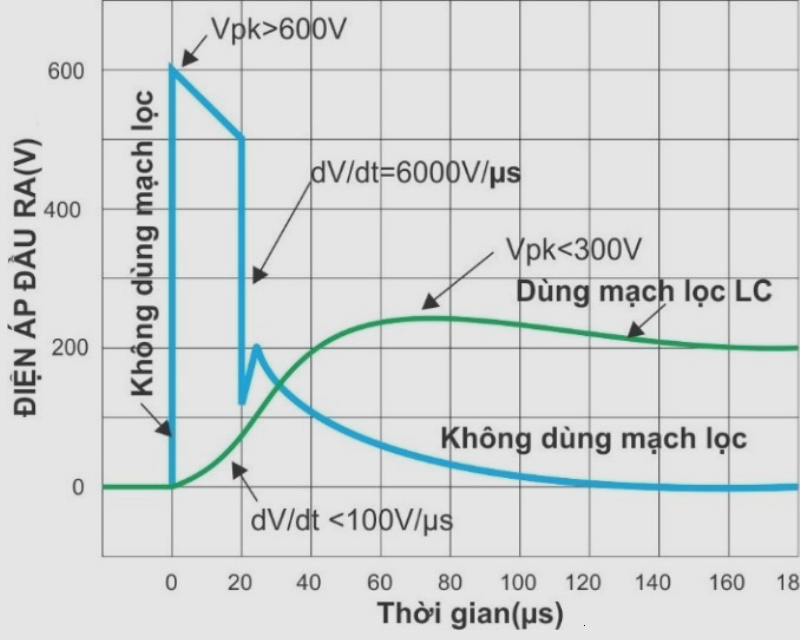 - Nhờ có bộ lọc thông thấp, tỷ lệ này giảm xuống rất nhiều lần và xuống dưới 100V/µs. Đỉnh xung điện áp cao cũng thấp hơn 300V và hoàn toàn có thể bảo vệ được thiết bị. Bên cạnh đó, bộ lọc LC cũng giúp làm giảm nhiễu RFI/EMI.
