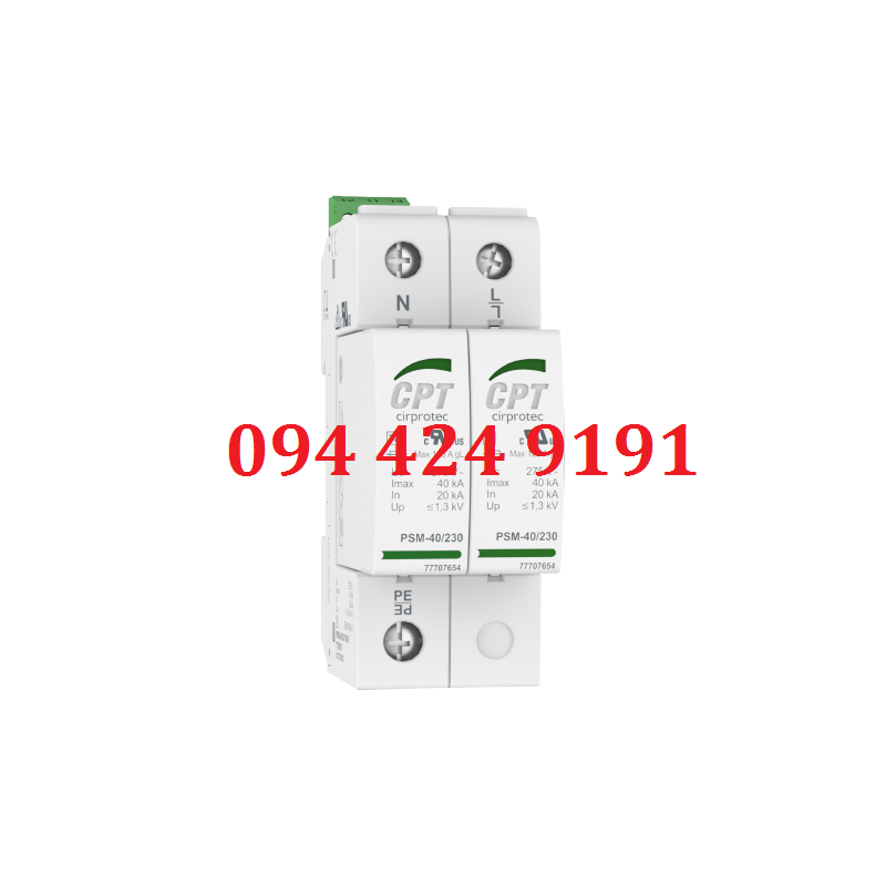 - Cắt sét 1 pha 1P+N, In: 20kA, Imax: 40kA bảo vệ Class 2, Type 2, phù hợp tiêu chuẩn IEC 61643-11, EN 61643-11, UL1449. Thời gian đáp ứng < 25ns. Mã hàng: PSM2-40/230TT. Xuất xứ: Cirprotec-Tây Nha. Đơn giá: 2.850.000 vnđ/bộ.