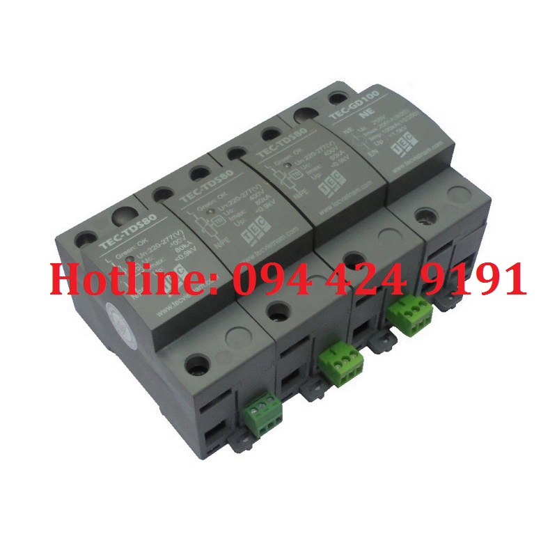 - Thiết bị cắt sét gắn trên DIN TEC TDS80bao gồm module bảo vệ L-N với mã hàng TDS80 & module bảo vệ N-E với mã GD100.