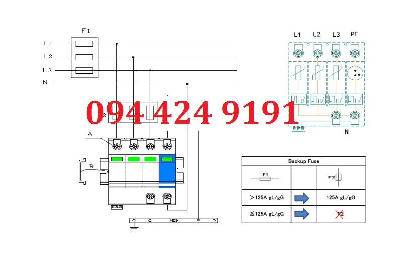 - Dòng tải phù hợp đấu nối chống sét | : ≤ 125A |