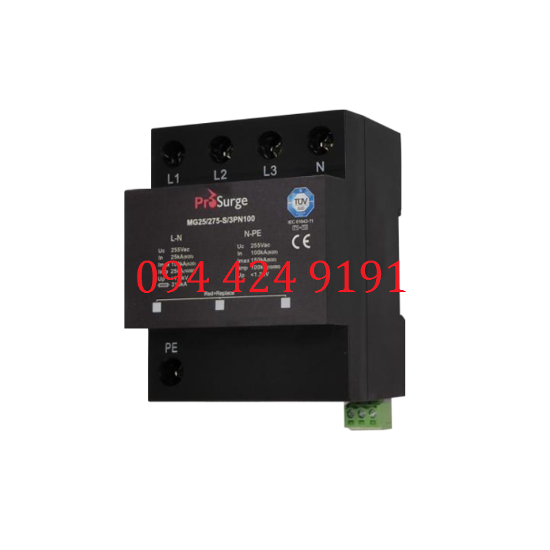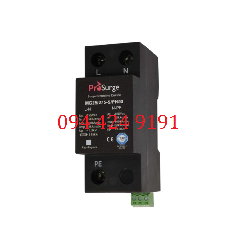 - Thiết bị chống sét lan truyền 1 pha 1P+N TSG MG25 Prosurge, cấu hình bảo vệ L-N & N-PE, khả năng cắt dòng sét trực tiếp giữa L-N/N-PE Iimp: 25kA/50kA xung 10/350µs, khả năng cắt dòng sét lan truyền L-N/N-PE Imax: 50kA/100kA xung 8/20µs. Mã hàng: MG25/275-PN. Xuất xứ: Prosurge-China.