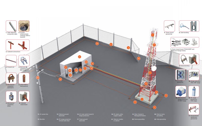 - Một hệ thống tiếp địa hoàn chỉnh bao gồm các điện cực tiếp địa thẳng đứng, điện cực tiếp địa nằm ngang, hợp chất giảm ổn định điện trở đất, hàn hóa nhiệt, các loại kẹp chuyên dụng để liên kết đẳng thế.