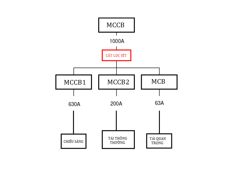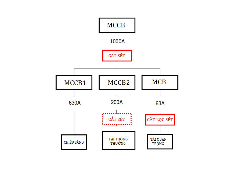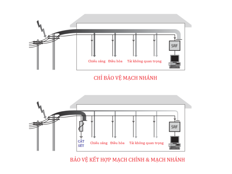 - Thiết bị trên MCCB1 và MCCB2 có thể được bảo vệ đầy đủ bằng cách sử dụng cắt sét mắc song song, vì loại thiết bị này thường không nhạy cảm với dv/dt cao. Tuy nhiên, với tải quan trọng lại nhạy cảm với dv/dt, do đó cần thêm lợi ích của chống sét lắp nối tiếp.